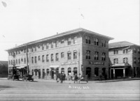 PC-2304 Corner view of the Hotel Perrine, showing the Shoshons St side; people and automobiles (car) are visible, along with the following businesses: Perrine Hotel Cigar Store; Abstacts and City Loans; Rexall Drug Store;