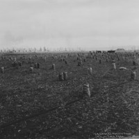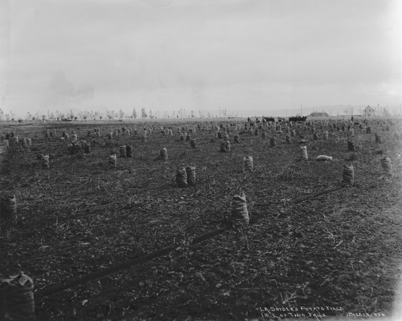 - "L.A. Snyder's Potato Field; 1 mile east of Twin Falls;" field of bagged potatoes, with buildings in the background.