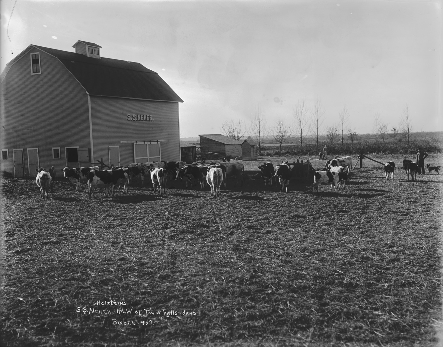 - "Holsteins. S.S. Neher. 1 mile west of Twin Falls; herd of cattle in a yard around a large barn.