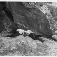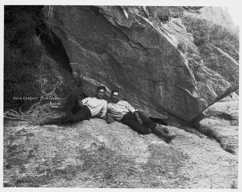 - "Solid Comfort. Our Idaho;" Two men in relaxing poses at the base of the canyon walls.