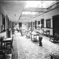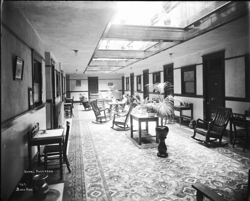 - "Hotel Rogerson;" man seated and reading in the lobby of the hotel.