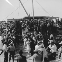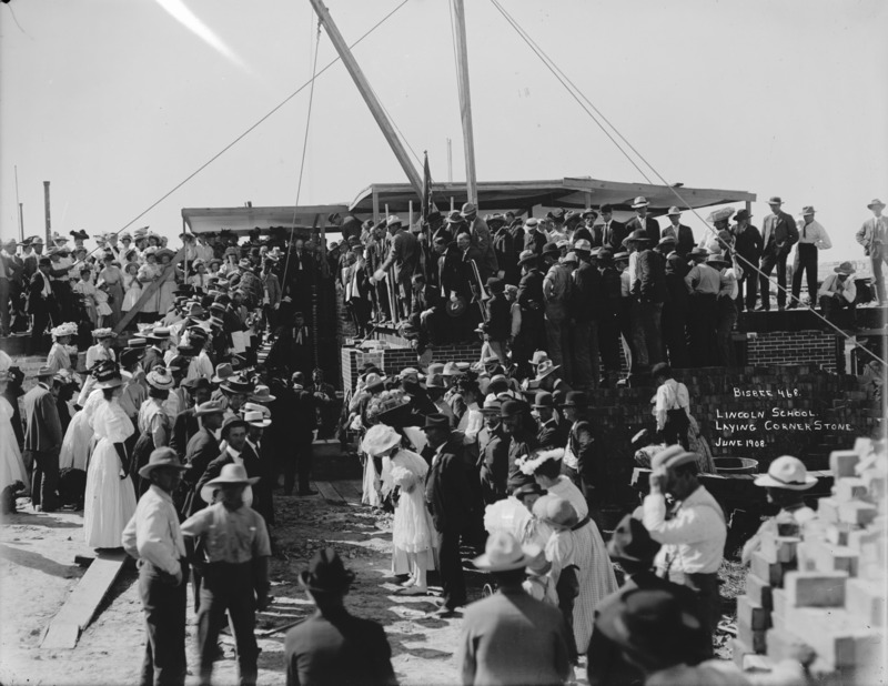 - "Lincoln School. Laying the Cornerstone. June, 1908;" crowd of people among the construction elements at the school site