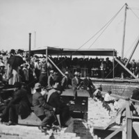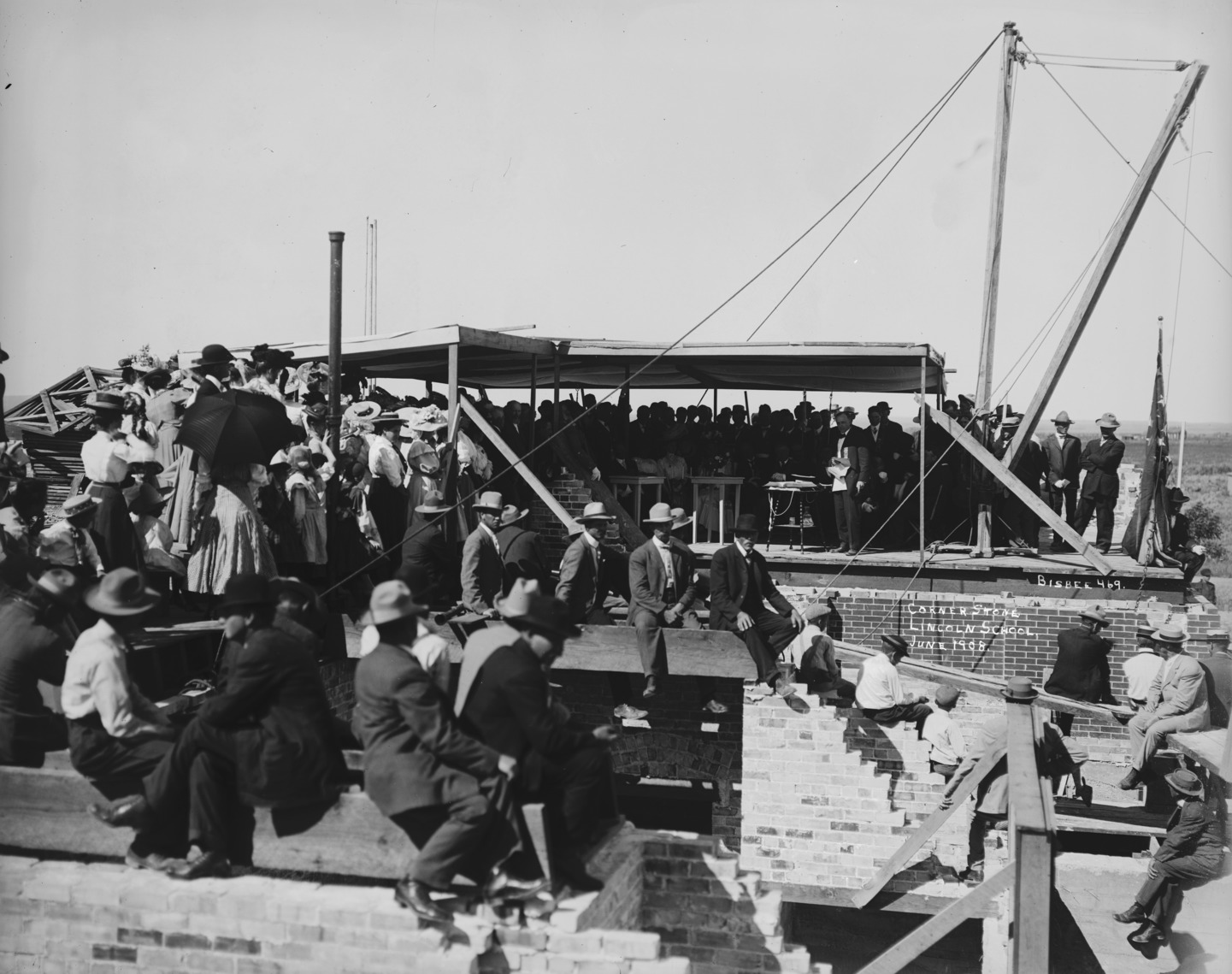 - "Cornerstone, Lincoln School. June, 1908;" a crowd among the construction elements at the school site, listening to a speaker