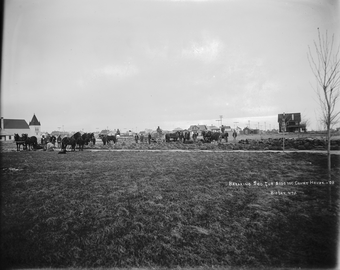 - "Breaking Sod for $150,000 Court House - 1908;" crowd of people gathered at the construction site of the County Court House, with many teams of horses.