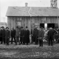 - "Twin Falls Fire Fighters, 1906;" fifteen men posing with a hand-operated pump beside a wood frame building