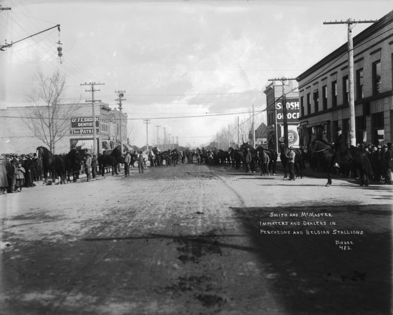 - "Smith and McMaster. Importers and Dealers in Percheons and Belgian Stallions;" Horses and men lined up on Shoshone Street in Twin Falls, Idaho. Also visible: Shoshone Grocery; Methodist Church; Dr. F.E. Snook, Dentist; The Patrie, Orpheum; part of the sign for the Lyric Theater