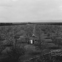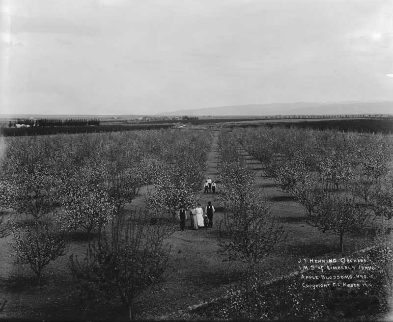 - "J.F. Henning Orchard. 1 mile south of Kimberly, Idaho. Apple Blossoms; Copyright 1912;" Several people standing in an orchard.