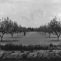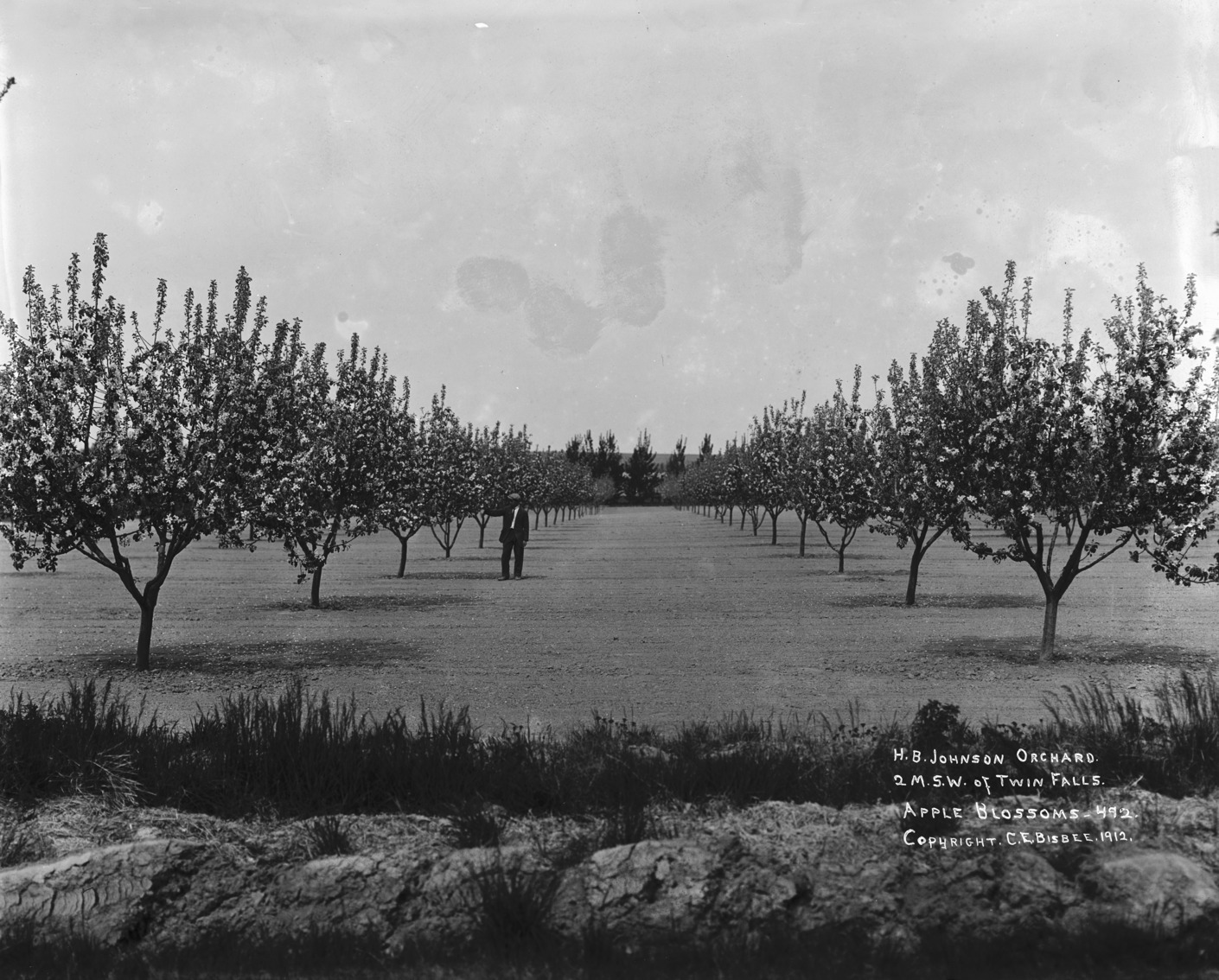 - "H.B. Johnson Orchard. 2 miles southwest of Twin Falls. Apple Blossoms. Copyright 1912;" man standing among fruit trees in blossom.