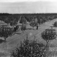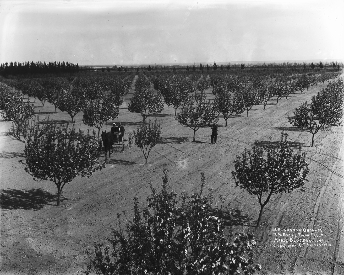 - "H.B. Johnson Orchard. 2 miles southwest of Twin Falls. Apple Blossoms. Copyright 1912;" Wide view of orchard with three men - two in a buggy, one standing - among fruit trees.