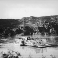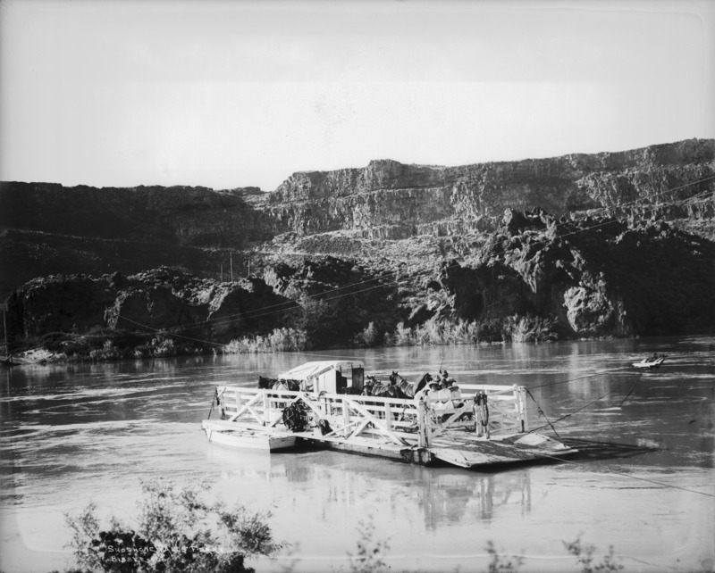 - "Shoshone Falls Ferry;" crossing the Snake River with people; a wagon, and a team of horses