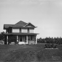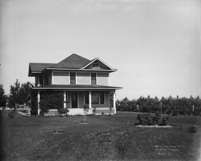 - "On a Five Acre Tract. Home of C. Harder;" View of a house with a large front lawn, surrounded by an orchard. A person stands in the berry patch to the right of the house.