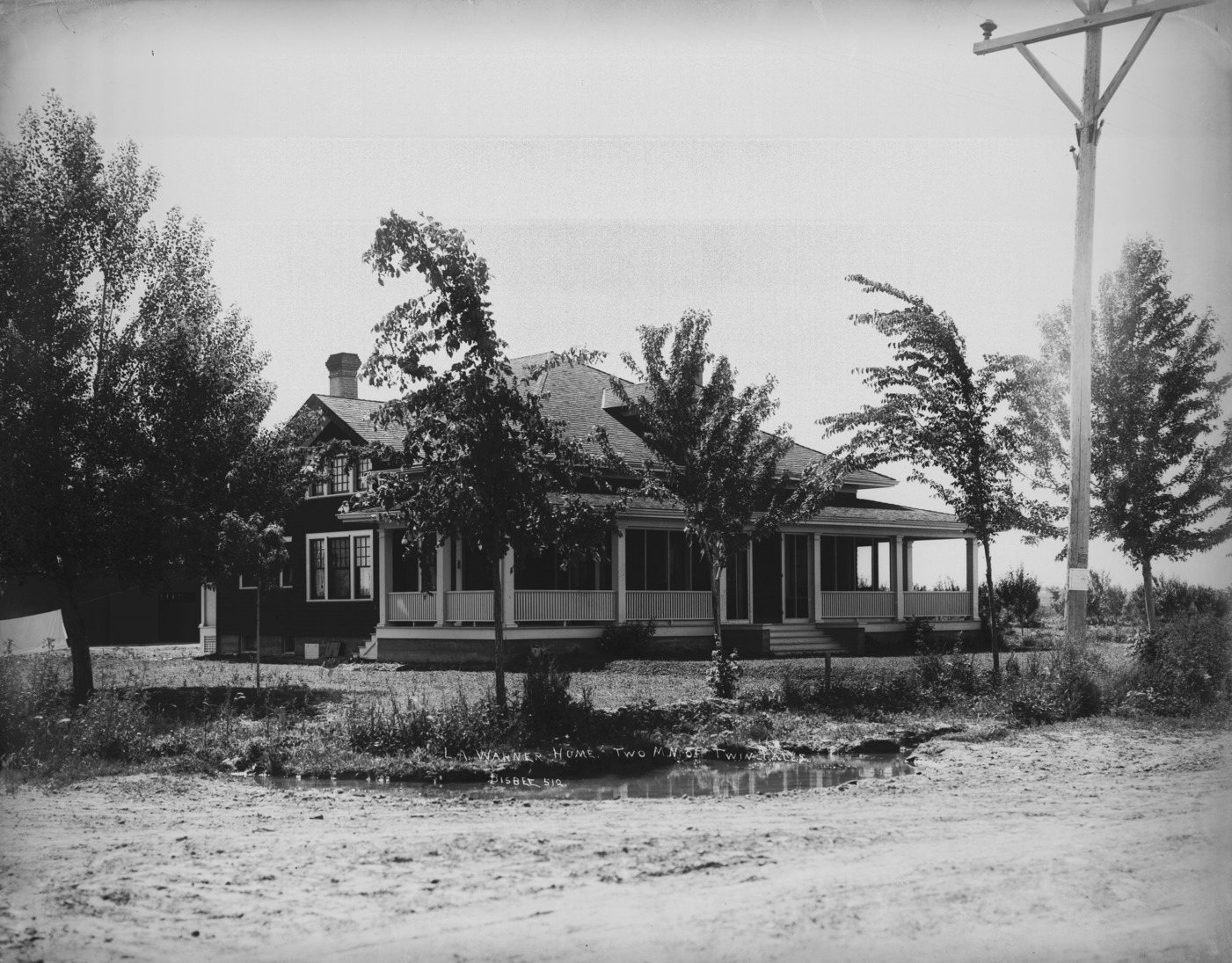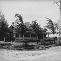 - "L.A. Warner Home. Two miles north of Twin Falls;" Corner view of house, with tree in front yard and utility pole