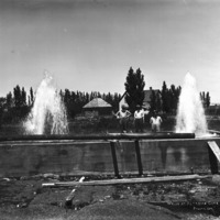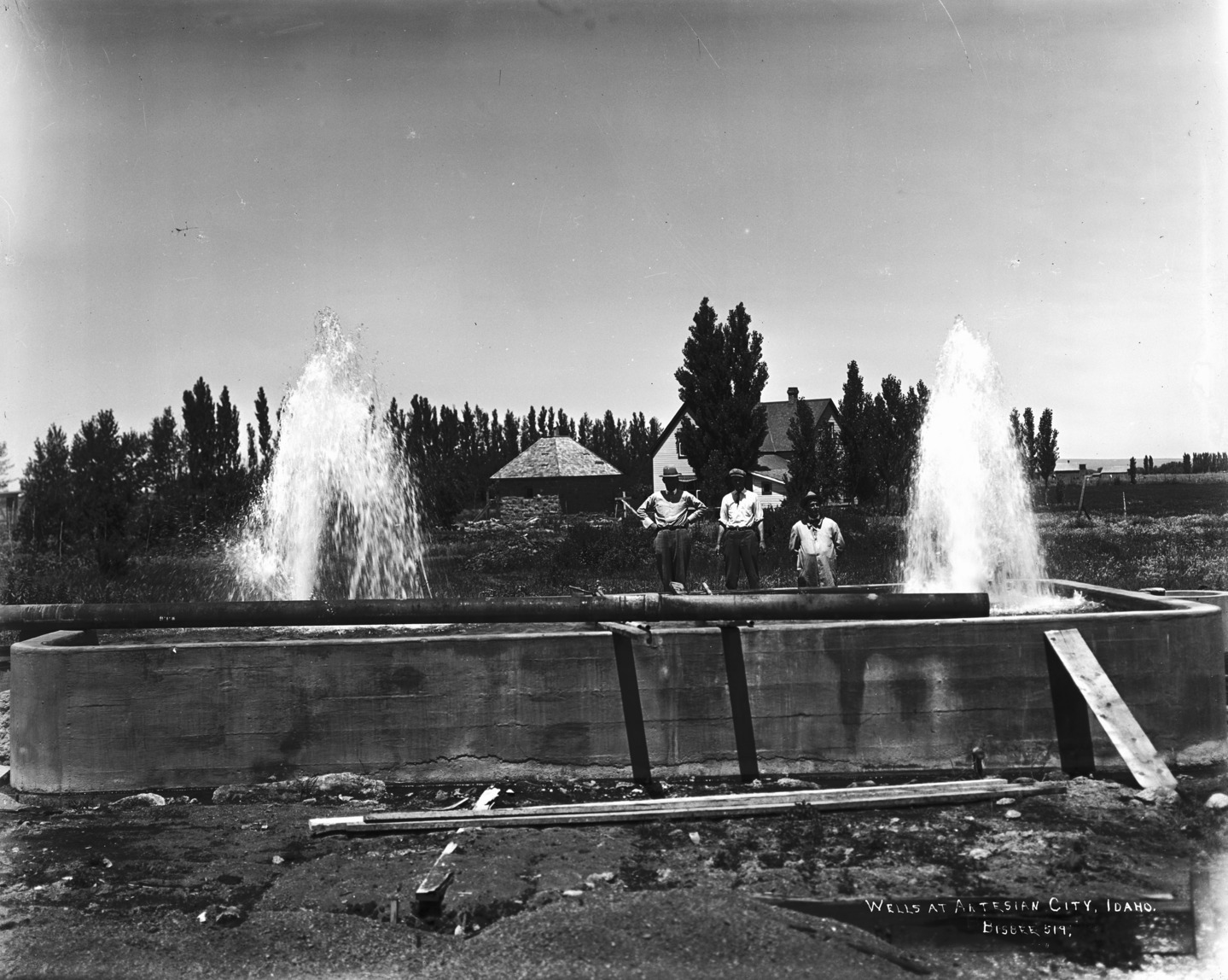 - "Wells at Artesian City, Idaho;" Three men standing behind artesian wells.