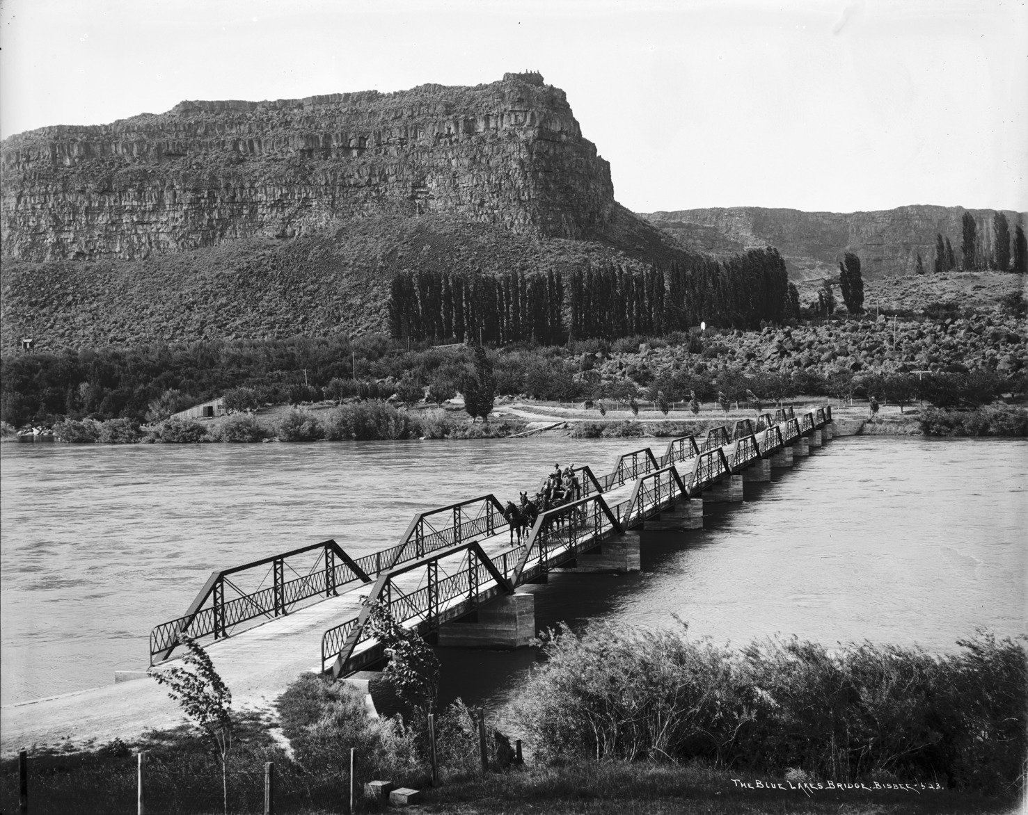 - "The Blue Lakes Bridge;" stagecoach crossing bridge; Perrine Ranch in the background, with poplar trees growing along the bank of the river
