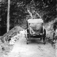 - "Overland;" View of the back of a stagecoach stopped on the way up a grade in the canyon; Perrine Coulee Falls in background; two men on the coach.