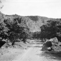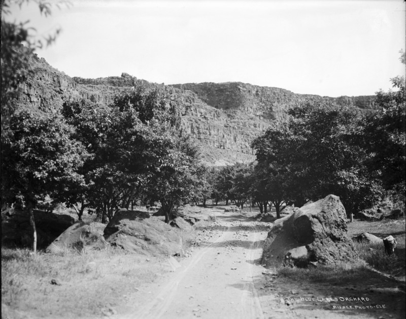 - "The Blue Lakes Orchard;" road running through orchard on the Perrine Ranch in the Snake River Canyon.