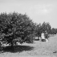 - "Cherry Trees. Fourth year. P.C. Davis. Twin Falls, Idaho;" man and a woman standing with dogs in an orchard.