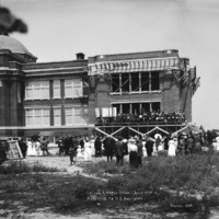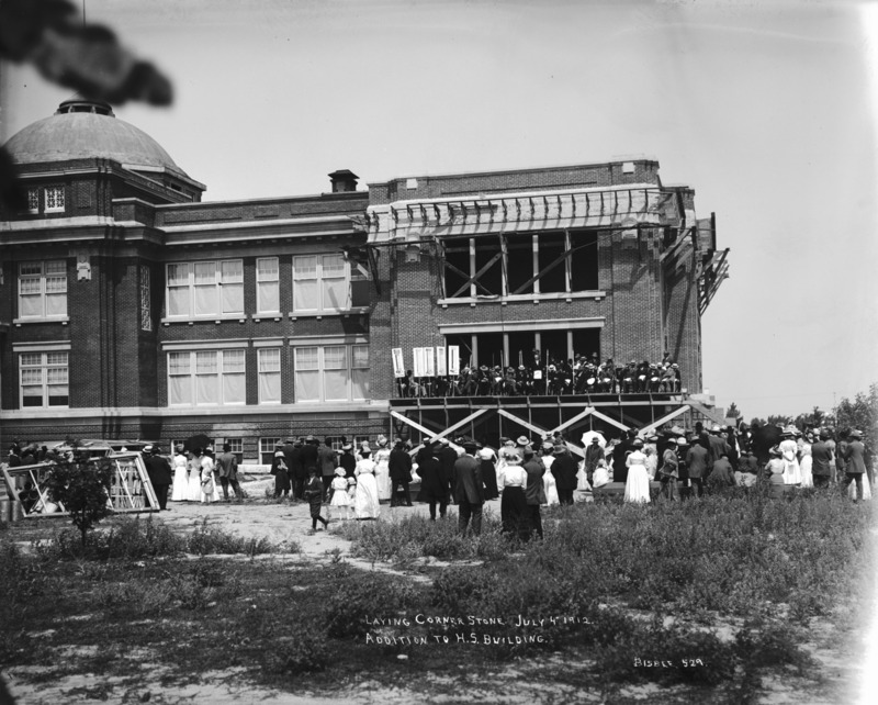 - "Laying Corner Stone. July 4th 1912. Addition to the High School Building;" crowd of people listening to speaker on scaffolding of new wing addition to Twin Falls High School.