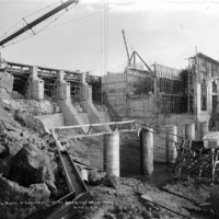 - "Power house in construction at American Falls, 1912;" view of large stone building.