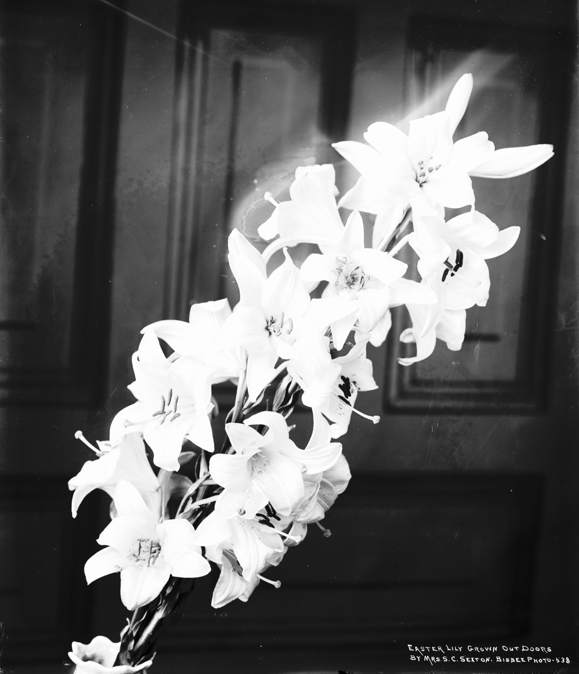 - "Easter Lily Grown Outdoors by Mrs. S.C. Sexton;" spray of flowers