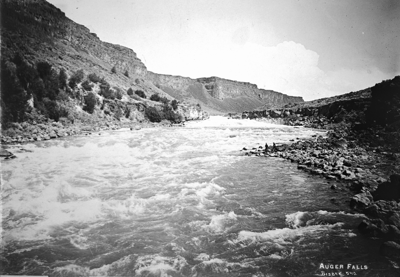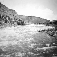 - "Auger Falls;" rapids on the Snake river south of Jerome, Idaho. Two men on rocky bar at the right.