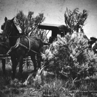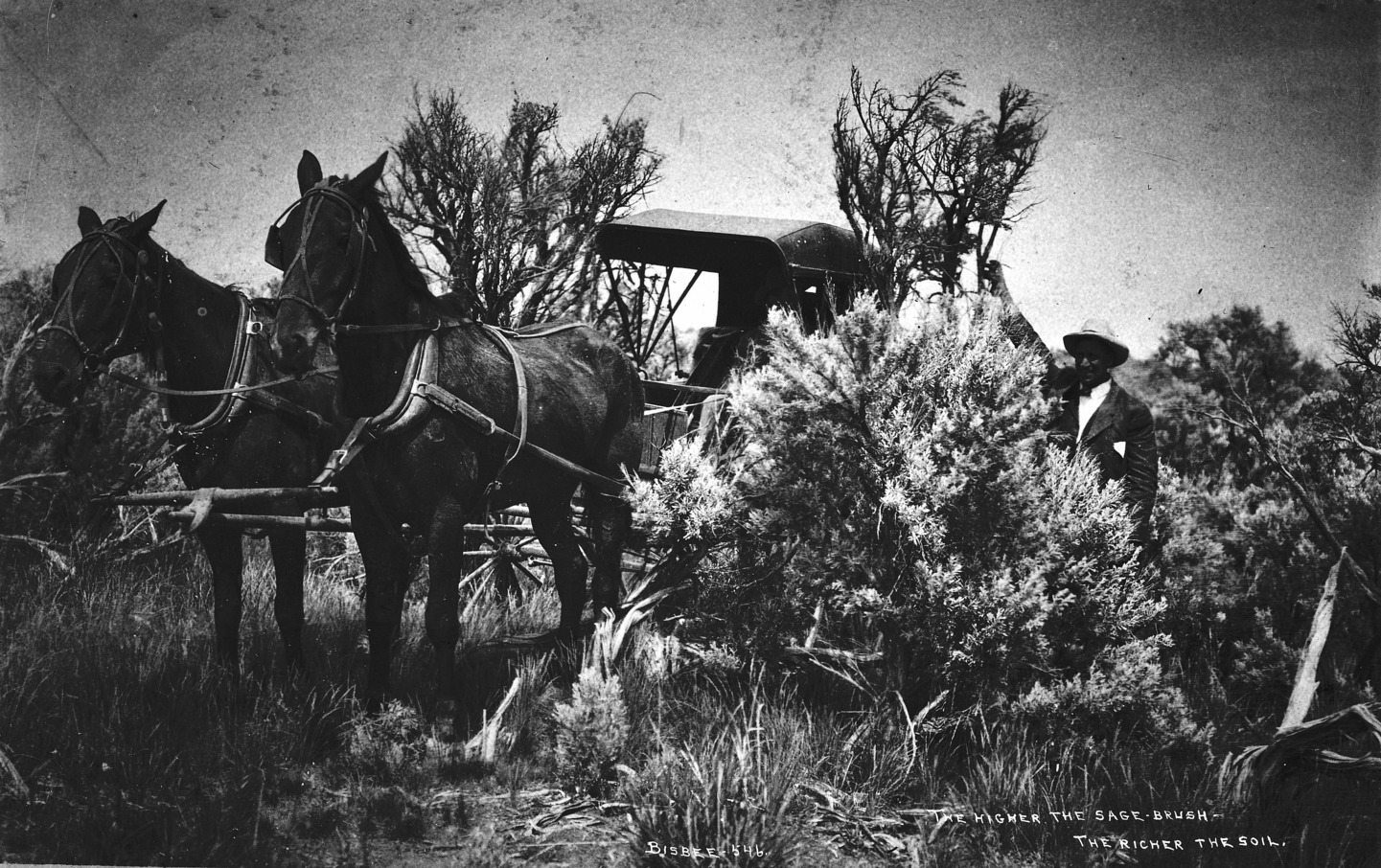 - "The Higher the Sagebrush, the Richer the Soil;" man standing amidst tall sagebrush, with a buggy and horses.