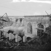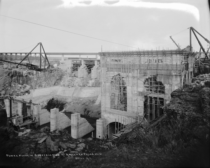 - "Power house in construction at American Falls, 1912;" view of large stone building; bridge in background