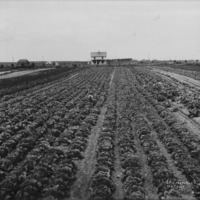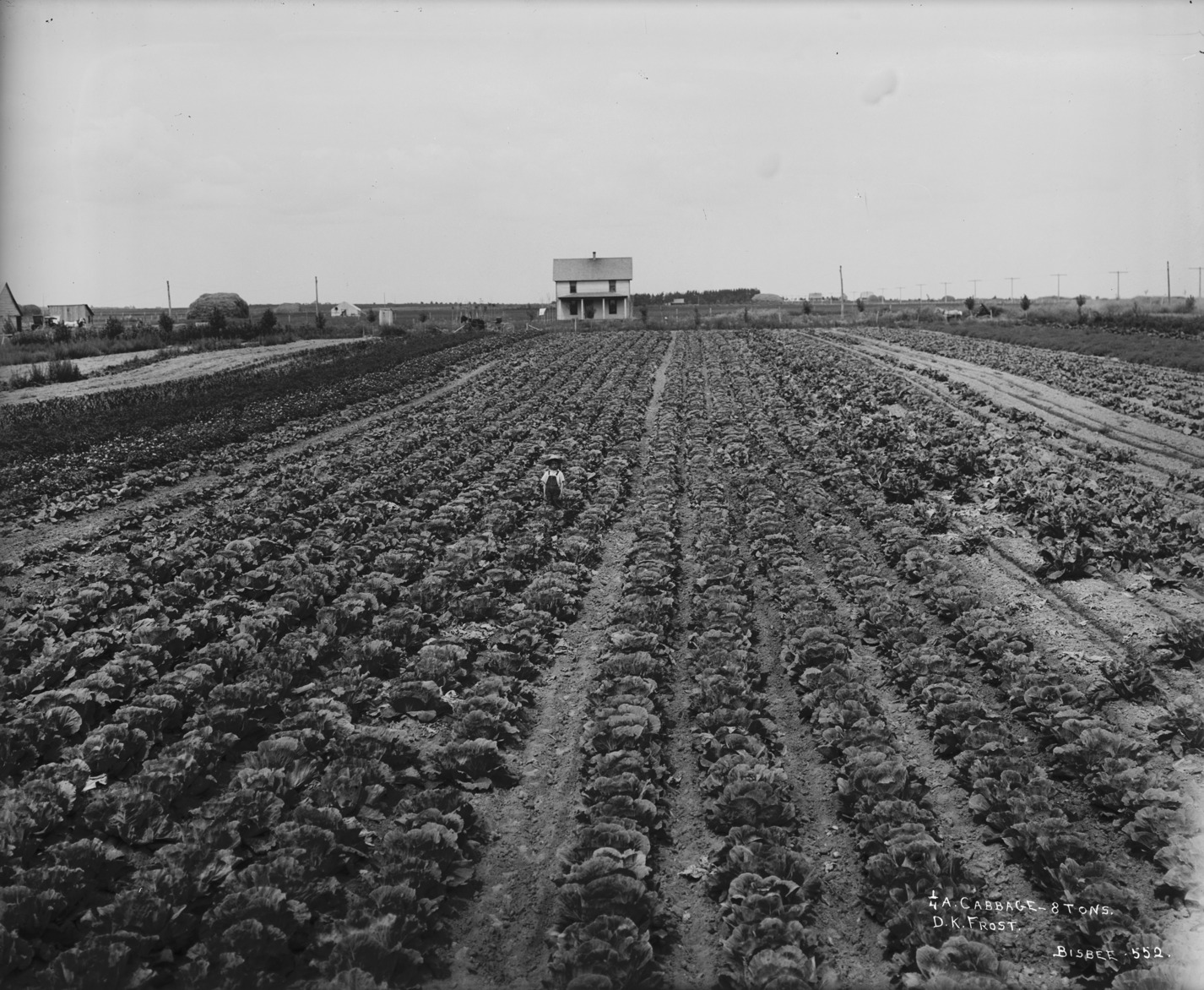 - "1/4 acres Cabbage - 8 Tons; D.K. Frost;" small child in a cabbage field, with a farm house/home and telephone poles in the background.