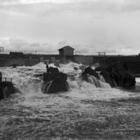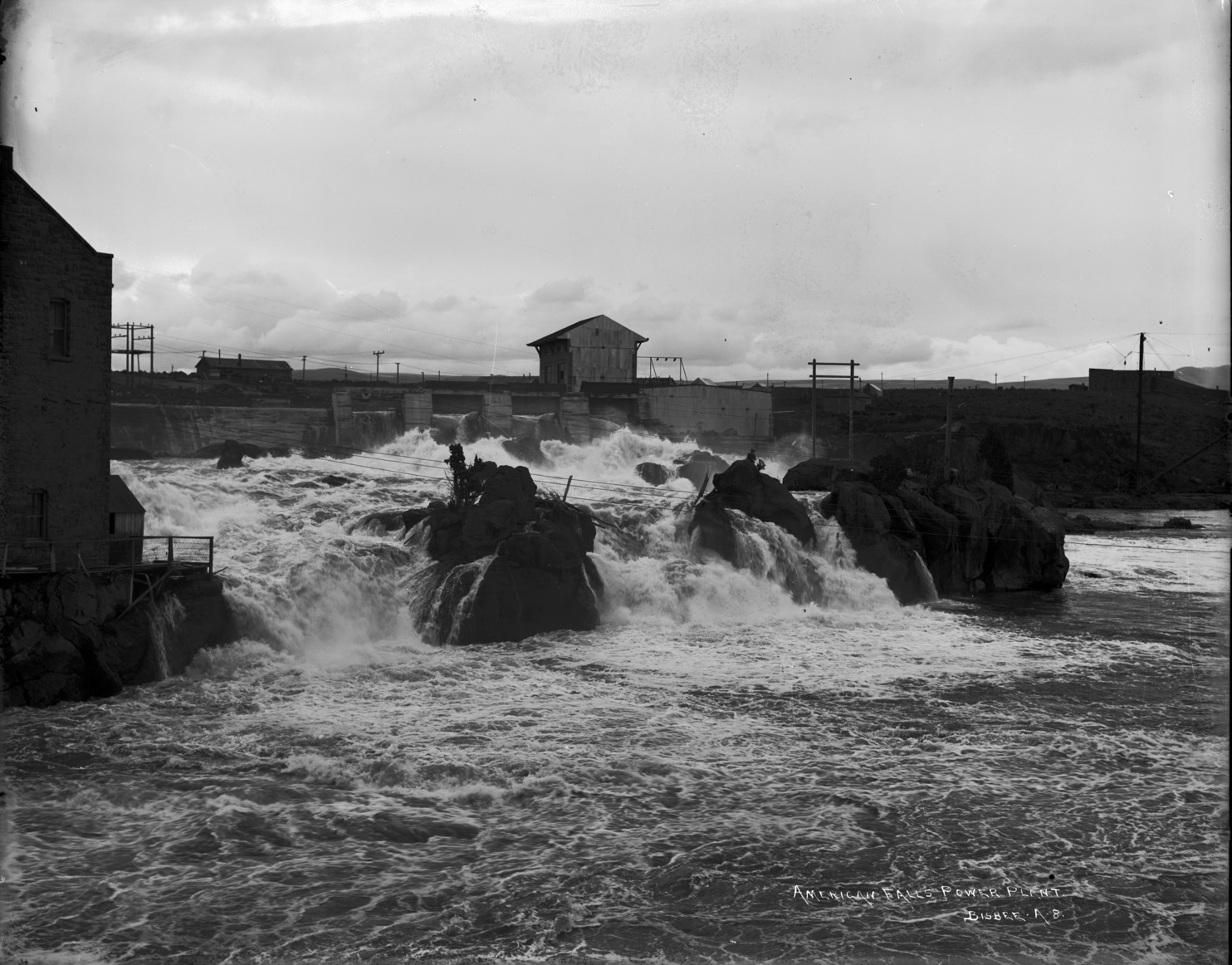 - "American Falls Power Plant;" view of smaller power plant building across falls.