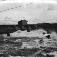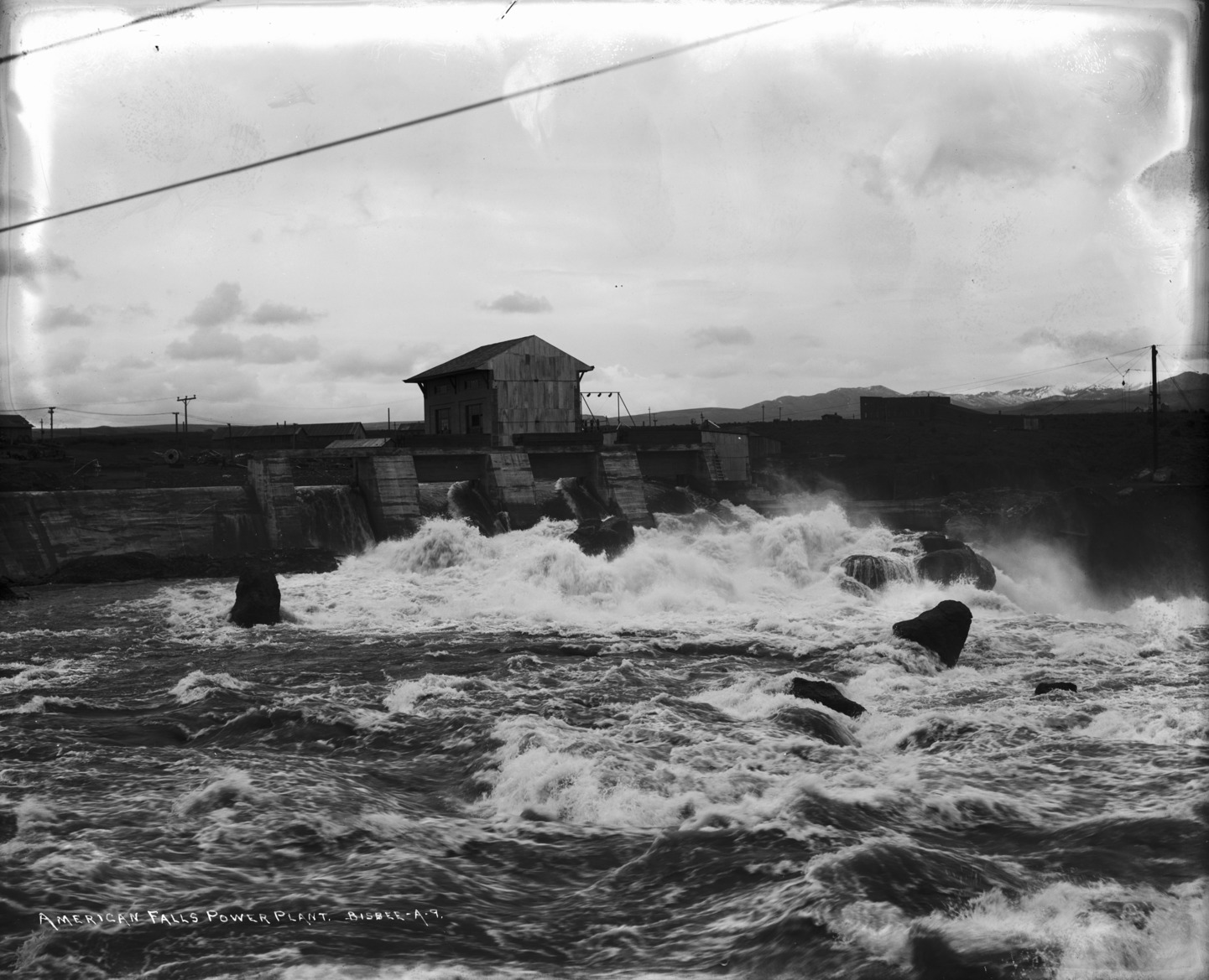 - "American Falls Power Plant;" view from across the falls at smaller building