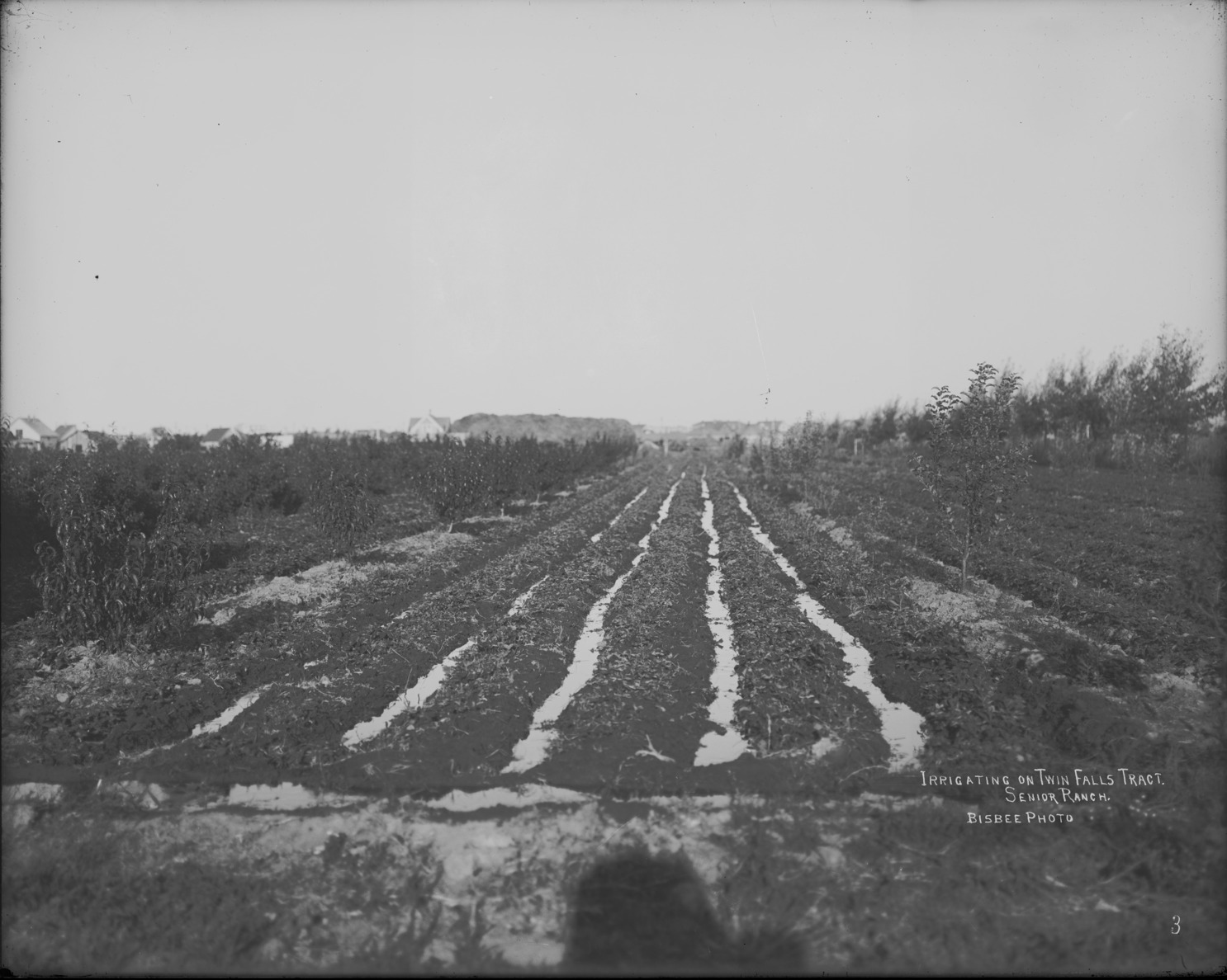 - "Irrigating on Twin Falls Tract, Senior Ranch." Field with residential buildings in the background.