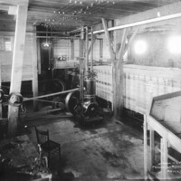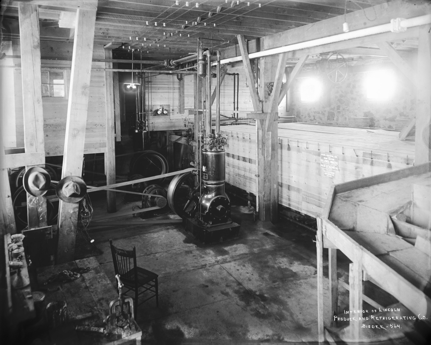 - "Interior of Lincoln Produce and Refrigerating Company;" interior of building showing machinery, chairs, and other miscellany.