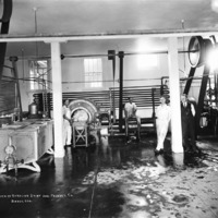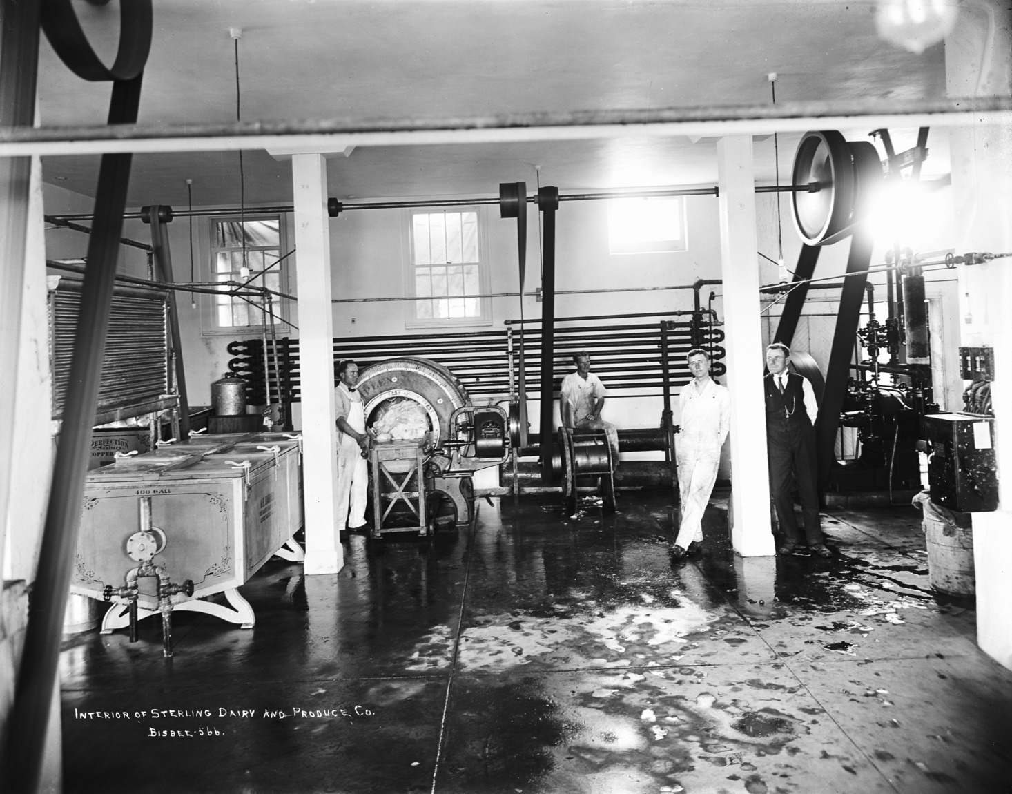 - "Interior of Sterling Dairy and Produce Company;" four men standing near machinery and tanks.