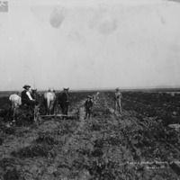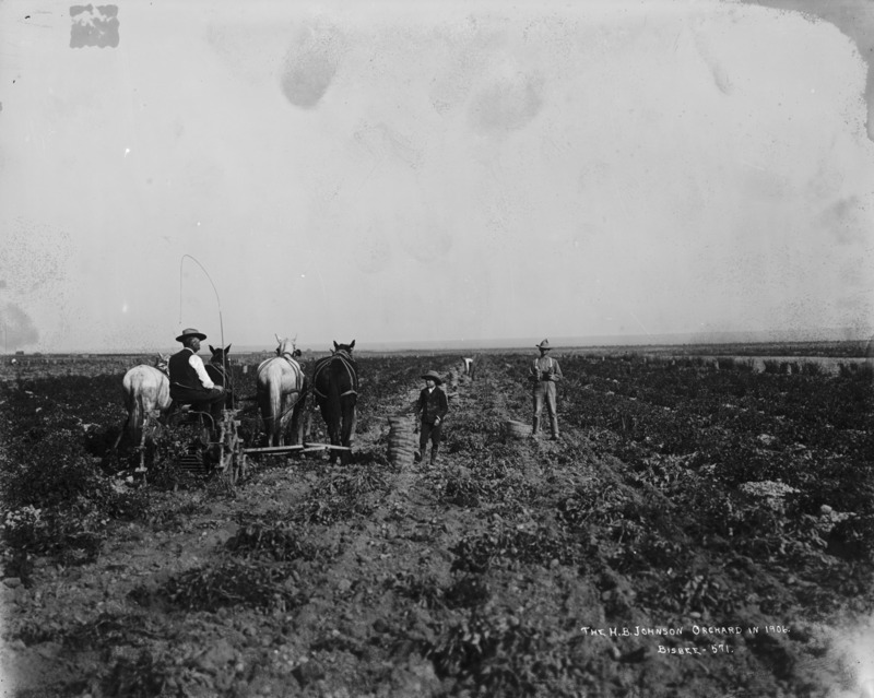 - "H.B. Johnson Orchard in 1906;" Horse-powered potato digging machine at work. Two men and a boy operating a four-horse team.