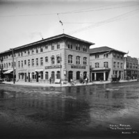 "Hotel Perrine. Twin Falls, Idaho;" corner view of the hotel on Main Avenue and Shoshone Street; people on sidewalks and cars and horse-drawn vehicles in street. Also visible: Bert Sowle; Perrine Hotel Cigar Store; Abstracts, Farm and City Loans; Rexall Drug Store (Skeels-Wiley Drug); Grocery; 5 and 10 Store. Large sign on corner states: Carnation Club Dance at Dreamland Hall. Every Tuesday and Friday Evening, Friedman's Piece Orchestra. Everybody Welcome