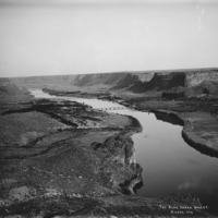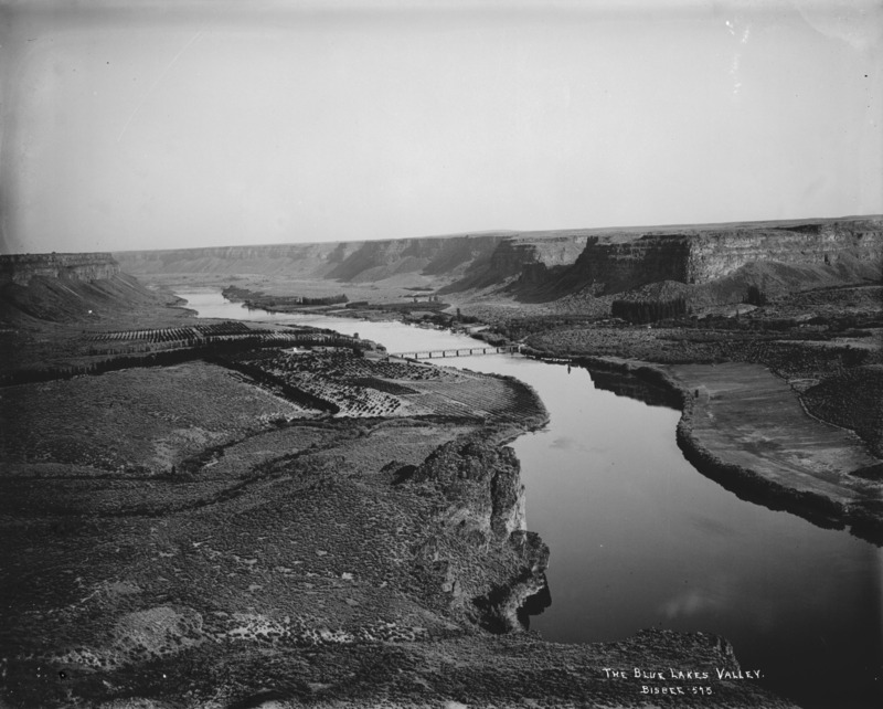 - "The Blue Lakes Valley;" Perrine Ranch area of the Snake River canyon, from the rim, showing the first Perrine Bridge.
