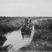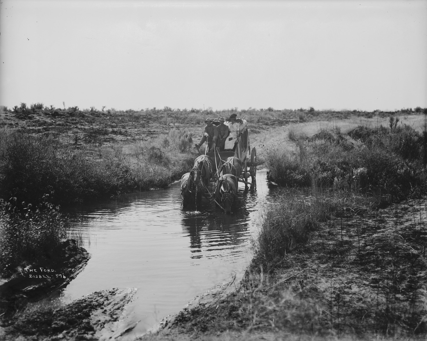 - "The Ford;" stagecoach stopped to give the horses a drink while fording a stream, with a woman and two men in the box seat.