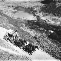- "Long Ago;" stagecoach on a grade into the canyon with one of the Blue Lakes in the background.