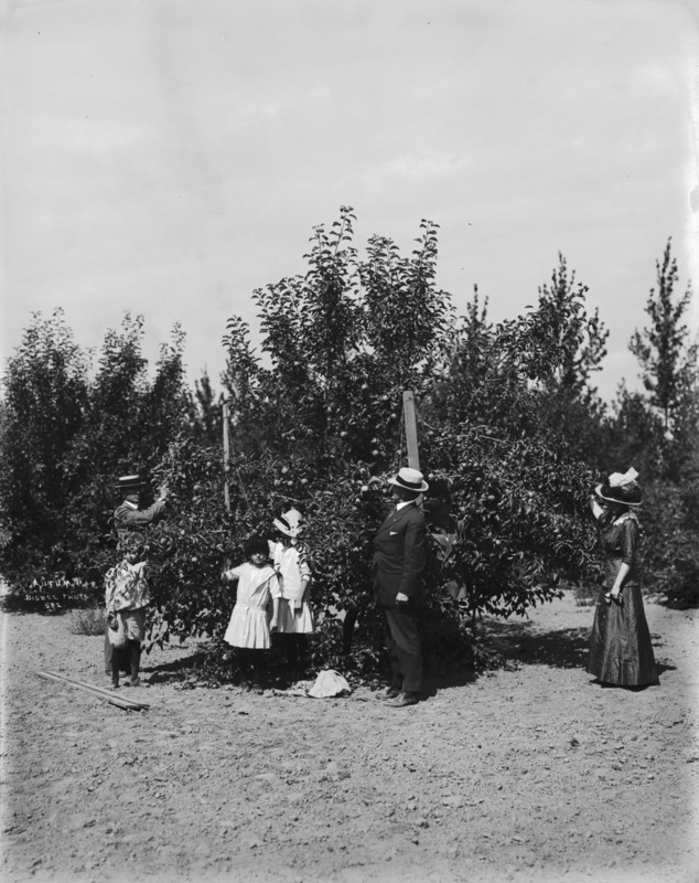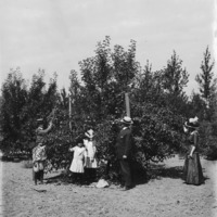 - "Autumn;" Two men, one woman, and three children standing beneath a fruit tree.