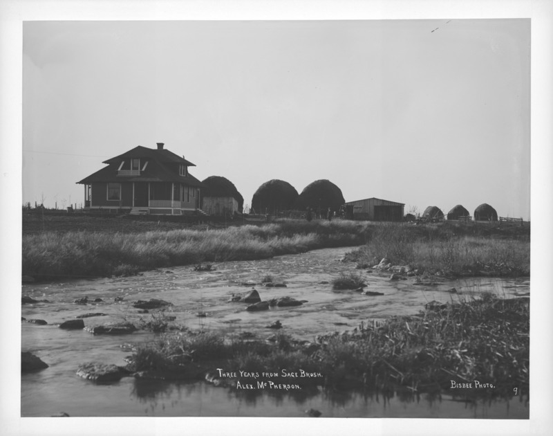 - "Three Years from Sagebrush; Alex McPherson." Home and ranch, near Twin Falls, Idaho. Men with wagon before a farm house.