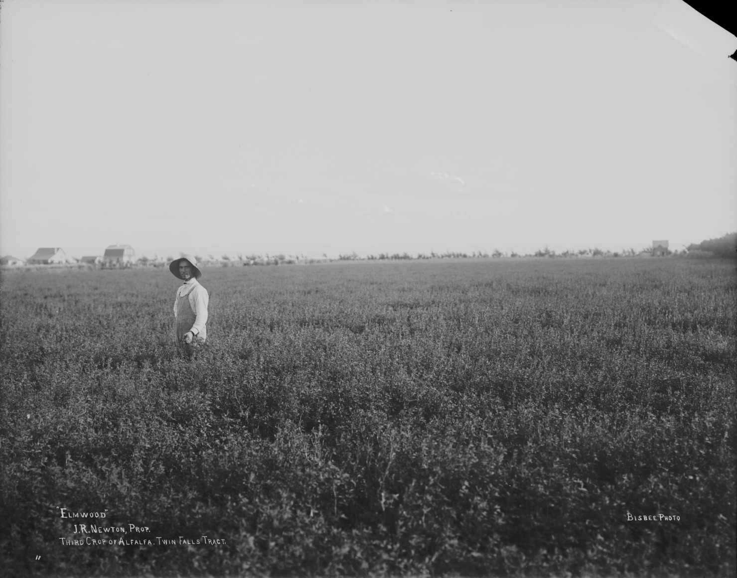 - "Elmwood; J.R. Newton, Proprietor; Third Crop of Alfalfa, Twin Falls Tract." Boy in alfalfa field.