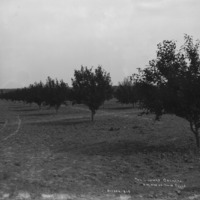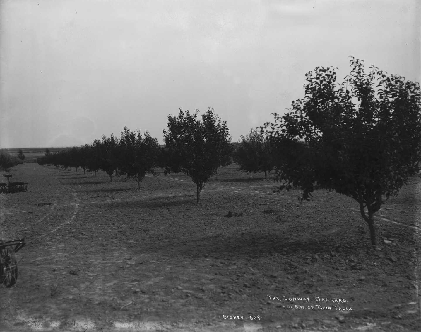 - "The Conway Orchard. 4 miles southwest of Twin Falls;" wide view of a row of fruit trees