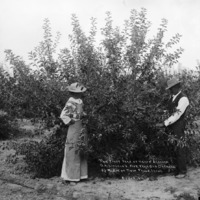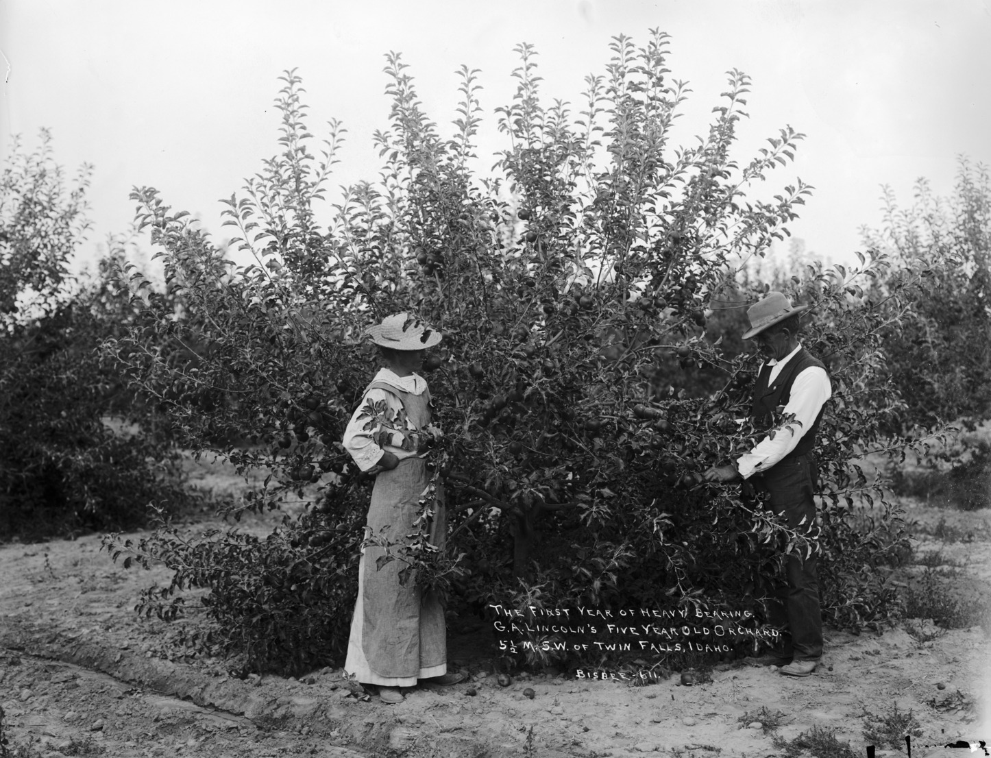 - "First year of Heavy Bearing. G.A. Lincoln's 5 year old Orchard, 5 1/2 miles southwest of Twin Falls, Idaho;" man and a woman near a fruit tree.