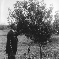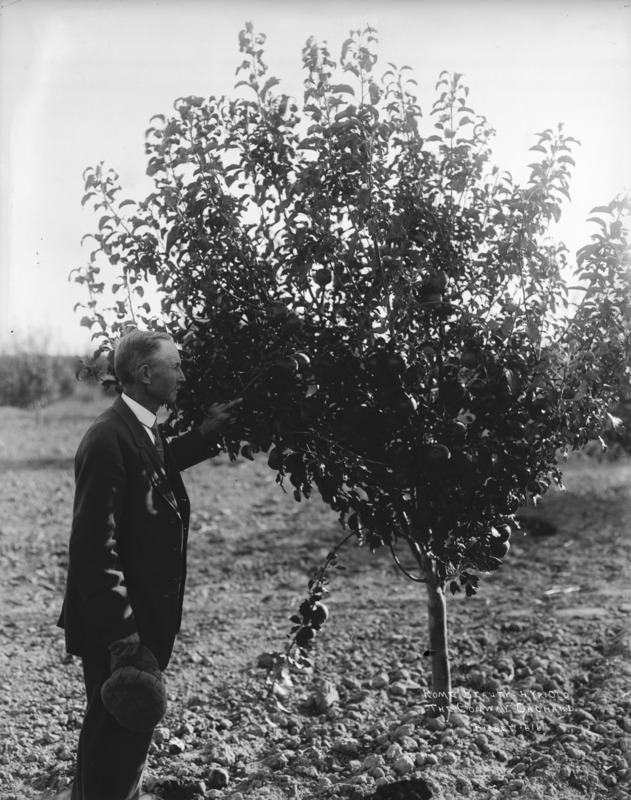 - "Rome Beauty - 4 Year Old. The Conway Orchard;" man standing by a small fruit tree.