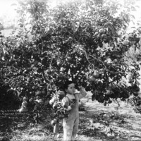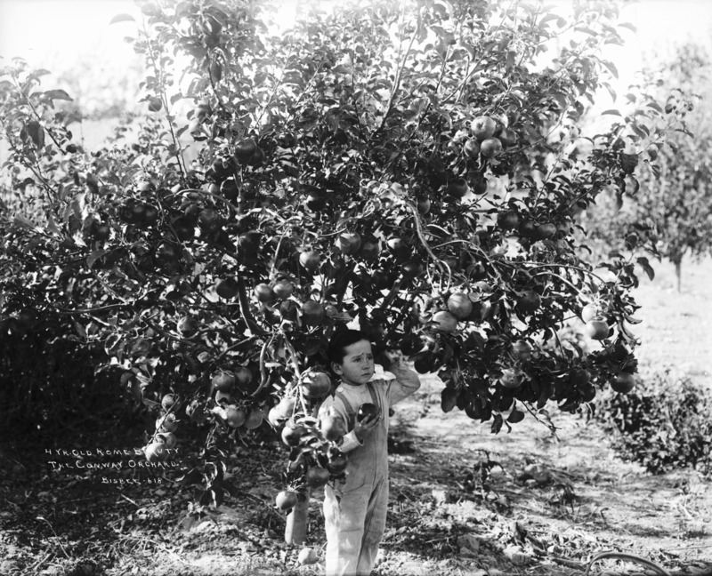 - "4 Year Old Rome Beauty. The Conway Orchard;" small boy holding an apple standing under a fruit tree.