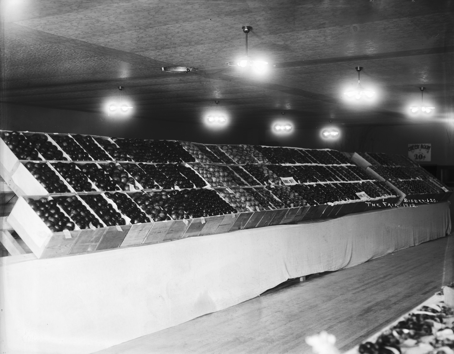 - "The Fair - 1912;" boxes of fruit displayed in a large room.