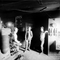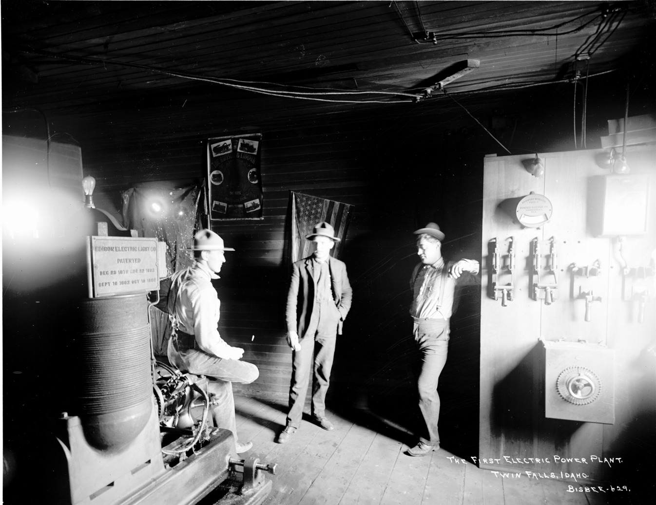 - "1st Electric Power Plant. Twin Falls, Idaho;" Three men standing beside electrical equipment in the Hotel Perrine.