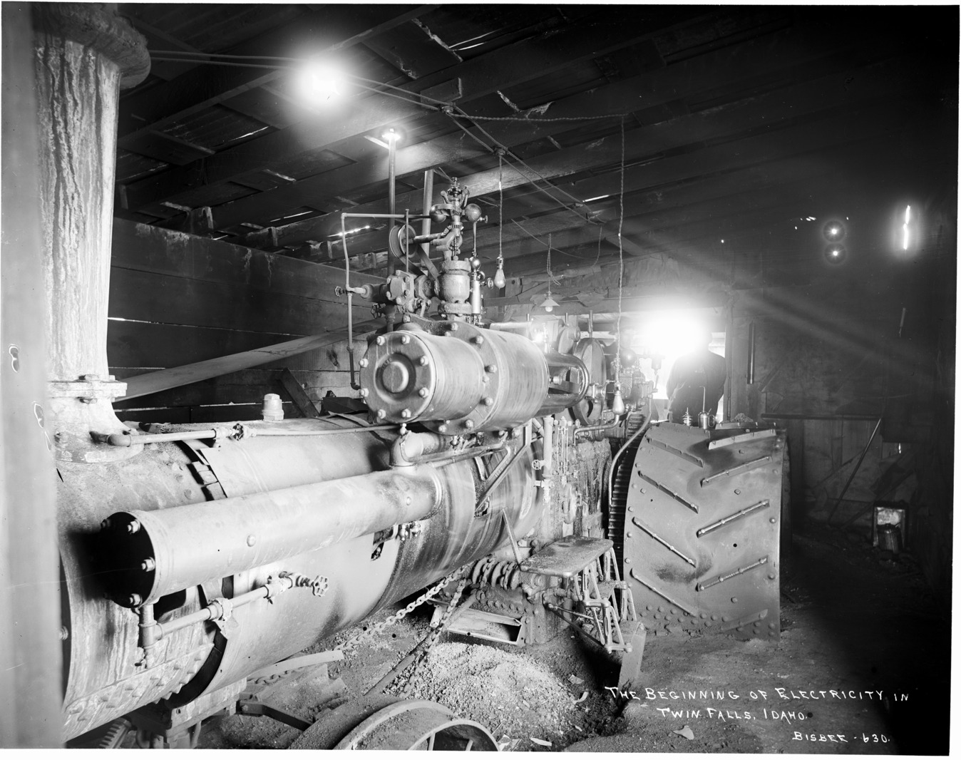 - "The Beginning of Electricity in Twin Falls, Idaho;" man standing in doorway of a room in the Hotel Perrine containing power equipment.