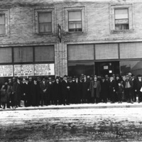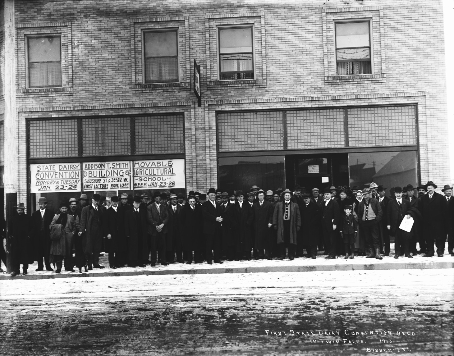 "First State Dairy Convention Held in Twin Falls, 1910;" group of men on sidewalk in front of Addison Smith Building, snow in the street. Sign on building states, "State Dairy Convention Monday and Tuesday, January 23-24; Addison T. Smith Building, Shoshone St and 3rd Ave W. First Lecture Monday 10 AM; Movable Agricultural School Week January 23-28"
