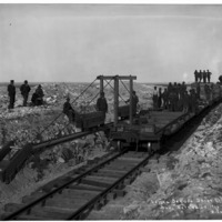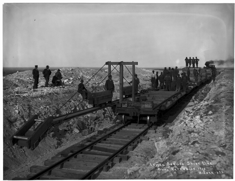 - "Laying the Oregon Short Line. Buhl Extension. 1906; men laying a railroad track.